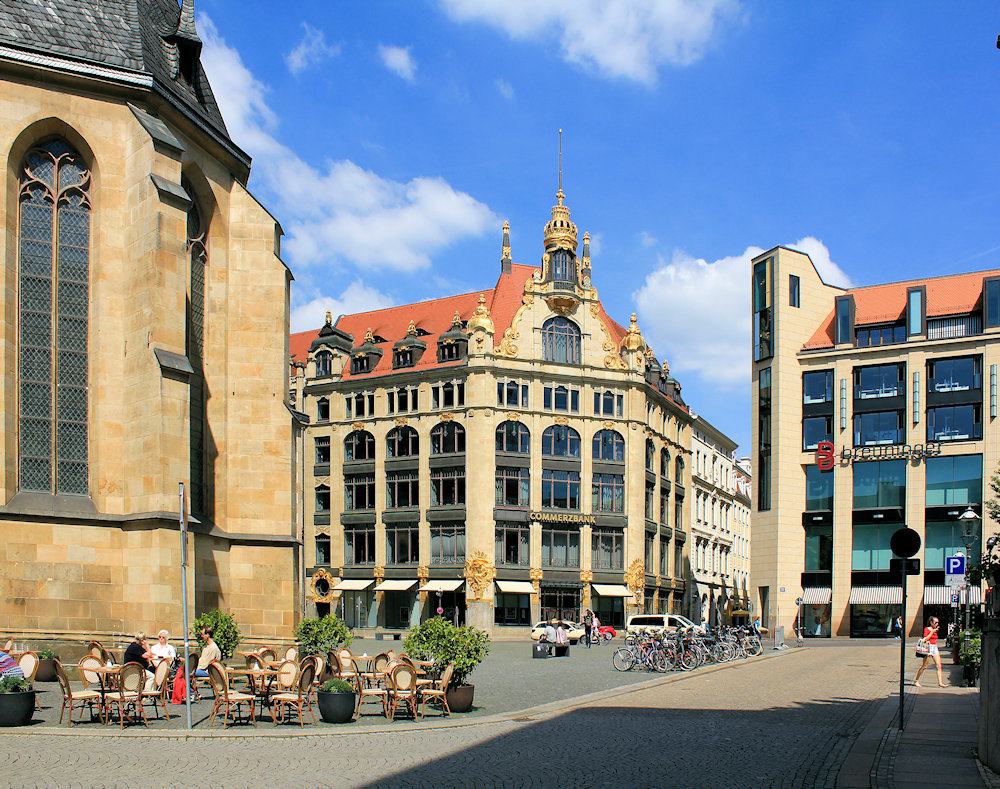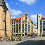 Das Kaufhaus Ebert in Leipzig steht zwischen Markt und Thomaskirche in Blockrandbebauung.