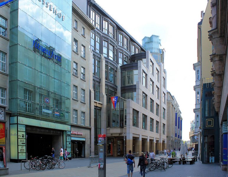 Das Kaufhaus Peek & Cloppenburg in Leipzig steht in der Petersstraße nahe dem Markt in Blockrandbebauung.