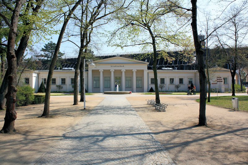 Lindenbad: Säulenportikus mit Dreiecksgiebel, Pilastergliederung - Dachform