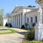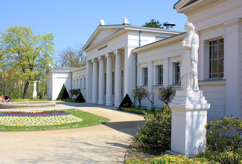 - Kurhaus: Putzfassade, Eck- und Mittelrisalite, Kolossalpilaster und Rundbogenblendarkaden, korinthische Säulen,