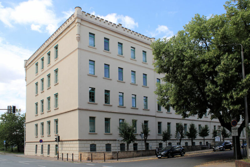 Landratsamt Meißen, Standort Riesa (ehem. Mudra-Kaserne; Kaserne des 3. Feldartillerie-Regiments Nr. 32), Stadt Riesa, Landkreis Meißen, Postleitzahl 01591, Adresse: Heinrich-Heine-Straße 1