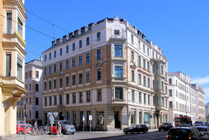 Das Wohnhaus Funkenburgstraße 2 in Leipzig steht in geschlossener Blockrandbebauung zwischen Waldplatz und Innenstadtring.
