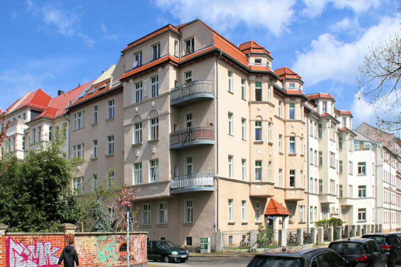 Das Wohnhaus Theodor-Neubauer-Straße 21 in Anger-Crottendorf steht in geschlossener Blockrandbebauung nahe der Trinitatiskirche.