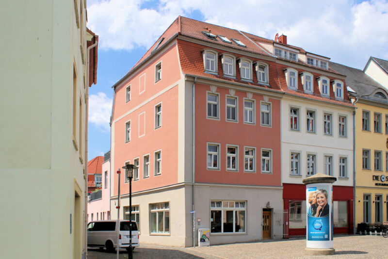 Das Wohn- und Geschäftshaus steht am Markt in Merseburg in Blockrandbebauung.