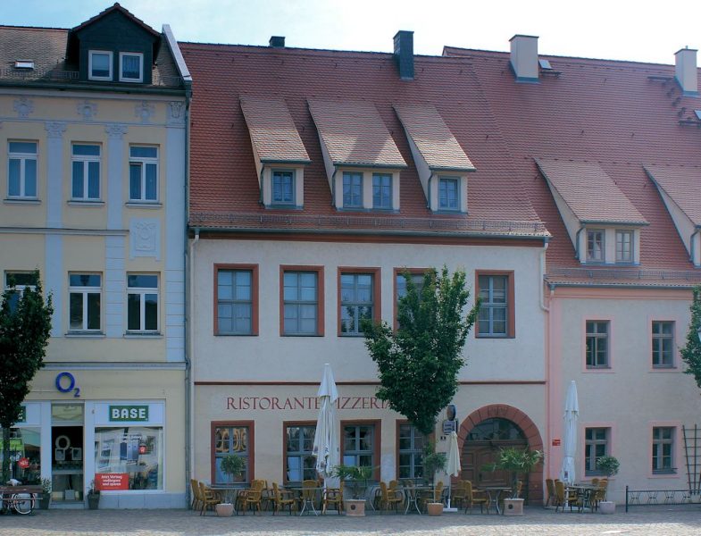 Das Wohn- und Geschäftshaus Markt 6 in Wurzen steht in Blockrandbebauung.