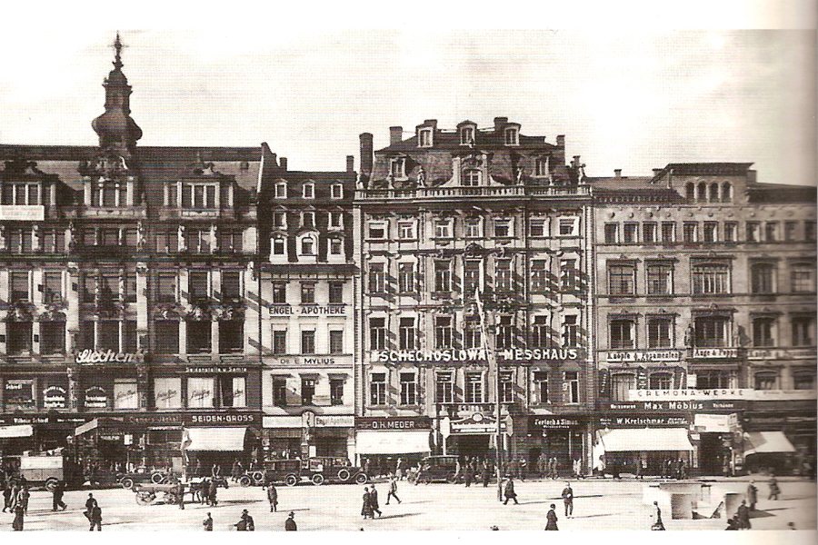 - Vorgängerbauten: Äckerleins Hof (1709 bis 1714 , Architekt Gregor Fuchs), Engel-Apotheke (seit 1728 an diesem Ort), Stieglitzens Hof (1894, Architekt Ottomar Jummel), Bismarckhaus (1894 bis 1895, Architekt Ottomar Jummel),