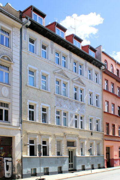 Das Wohnhaus Martinstraße 11 in Anger-Crottendorf steht in geschlossener Blockrandbebauung zwischen dem Liselotte-Herrmann-Park und dem Lene-Voigt-Park.