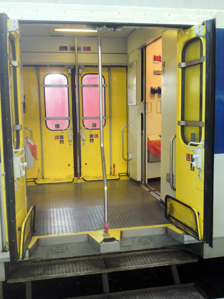 Im April 2016 fuhr ich wieder in Richtung Chemnitz, mit Fahrrad und Gepäcktaschen. Wieder drei Stufen, wieder eine schmale Tür – der Einstieg gestaltete sich schwierig und war letztendlich nur durch Hilfe durch andere Fahrgäste möglich. Letzte Woche war ich wieder mit dem Fahrrad in Richtung Chemnitz unterwegs und sah zu meiner Freude, es gibt auch zweiflügelige Türen. Ich öffnete die Türen und stand vor einer Stange. Also wieder drei Stufen, eine schmale Tür.