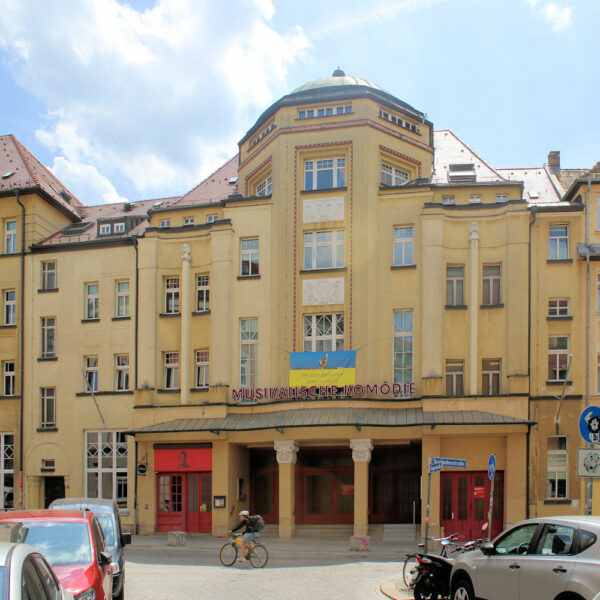 Die Musikalische Komödie in Altlindenau steht zwischen dem Palmengarten und dem Lindenauer Markt in geschlossener Blockrandbebauung.