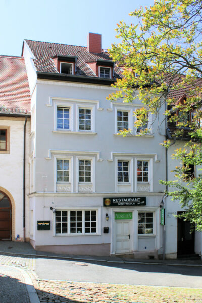 Das Wohnhaus Nicolaiplatz 11 steht zwischen dem Schloss Moritzburg und der Michaeliskirche in geschlossener Blockrandbebauung.