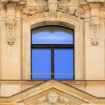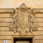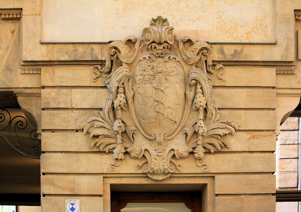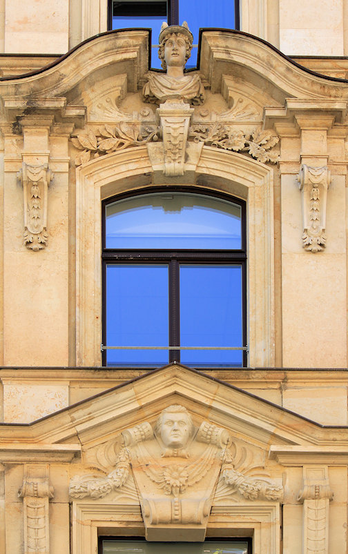 - Sandsteinfassade, schmiedeeiserne Tore, Betonung der Mittelachse durch Kartusche, Schlussstein mit Büste, gesprengter Giebel mit Merkurkopf