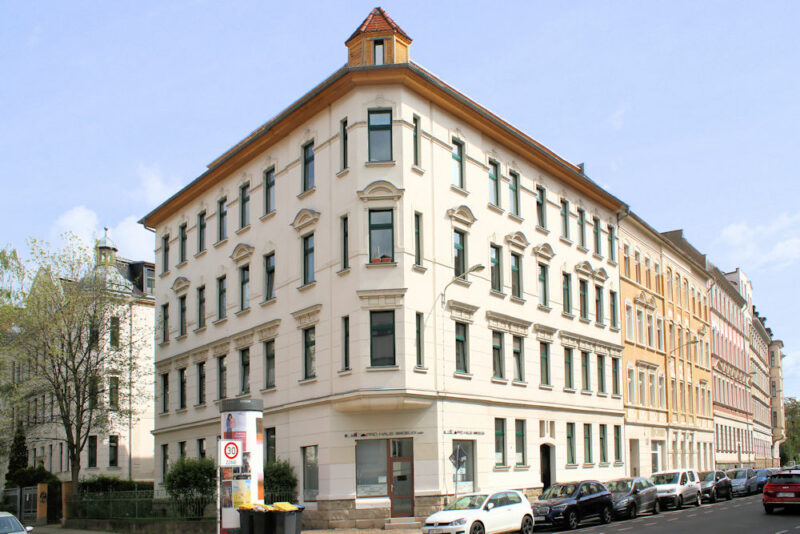 Das Wohnhaus Oststraße 65 in Reudnitz steht am Möbiusplatz in geschlossener Blockrandbebauung.