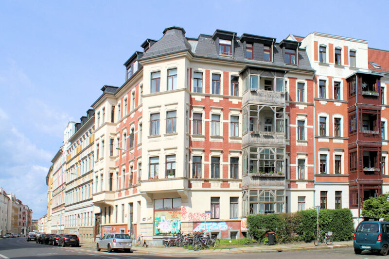 Das Wohnhaus Oststraße 73 in Reudnitz steht am Möbiusplatz in geschlossener Blockrandbebauung.