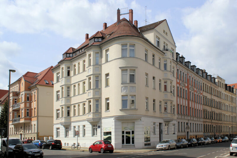 Das Wohnhaus Oststraße 74 in Reudnitz steht am Möbiusplatz in geschlossener Blockrandbebauung.