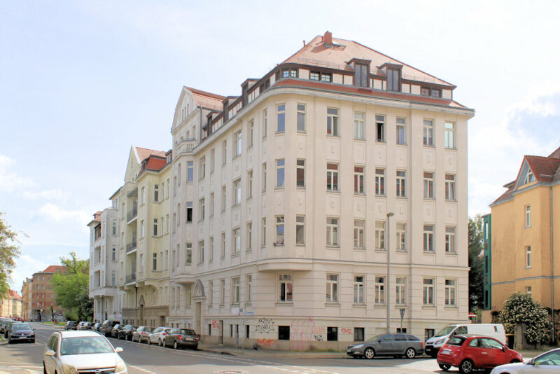 Das Wohnhaus Oststraße 76 in Reudnitz steht am Möbiusplatz in geschlossener Blockrandbebauung.