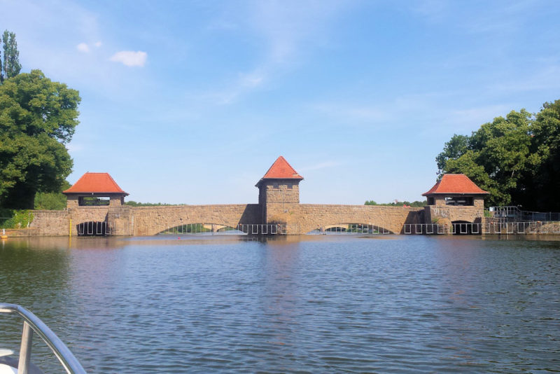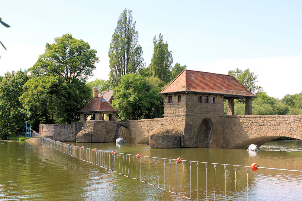 - wuchtige Wehranlage als kombiniertes Walzen-Schützen-Wehr mit Aufbauten und Brücke