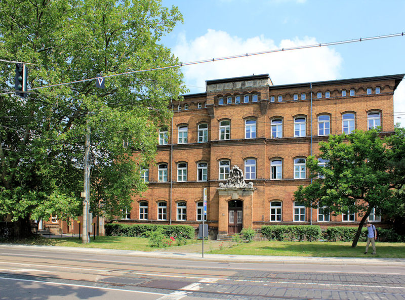 Das ehem. Parkkrankenhaus für Psychiatrie in Reudnitz steht frei in einer Grünanlage nahe dem Technischen Rathaus.