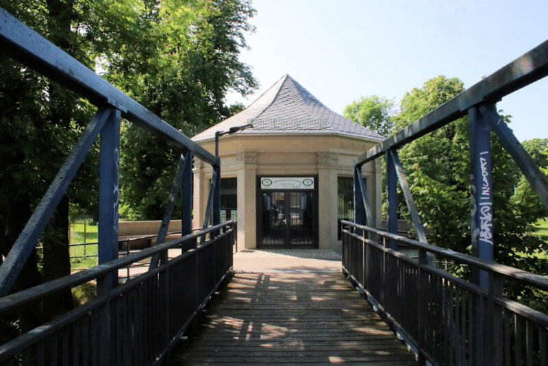 Der Pavillon steht gegenüber dem Bahnhof Zeitz, nördlich der Altstadt von Zeitz an der Weißen Elster als Solitärbau.