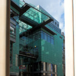 - Verkleidung mit kupfergrünen Platten, aus der Fassade heraustretende, geometrische Körper, bandartiger Vorbau im 2. Obergeschoss, darunter sägezahnartig versetzte Vorsprünge