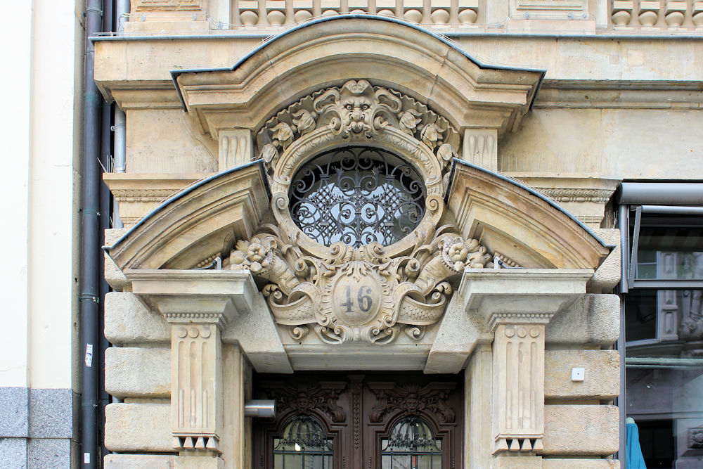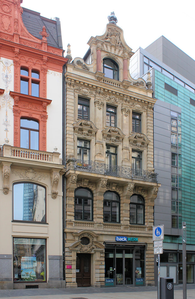 - Sandsteinfassade, Erdgeschoss und erstes Obergeschoss durch Balkon von den darüberliegenden Geschossen getrennt, Gestaltung mit schweren Rustikaformen, Wohngeschosse mit Pilastergliederung, Zwerchgaube mit Schweifgiebel und Säulenrahmung