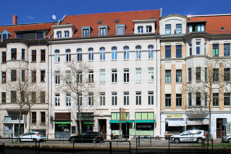 Das Wohnhaus Prager Straße 35 steht in geschlossener Blockrandbebauung zwischen dem Ostplatz und dem Alten Messegelände in Leipzig.