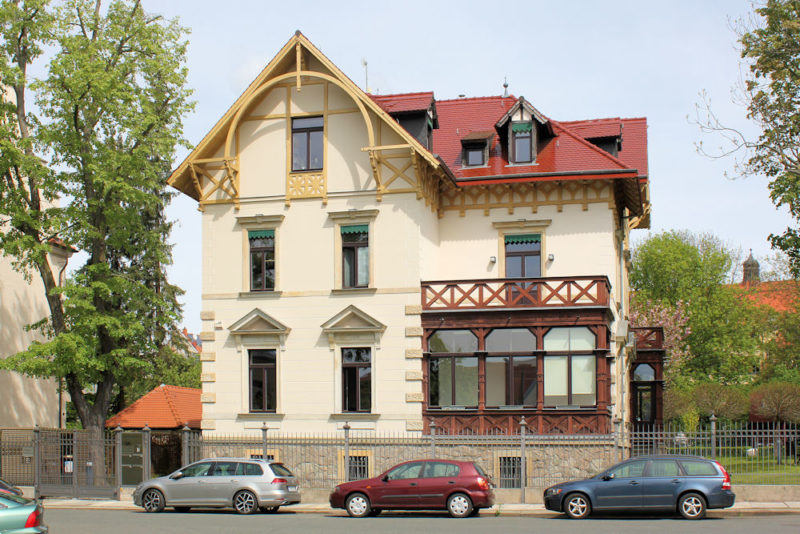 Die Villa Prinz-Eugen-Straße 31 in Connewitz nahe der St. Bonifatius-Kirche in offener Blockrandbebauung.