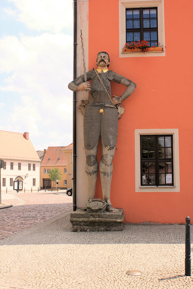 - verputzter Bruchsteinbau, Zwerchhäuser, Volutengiebel, Sitznischenportal, Rundbogenportal, drei Wappen, Gaffköpfe, Freitreppe, überlebensgroße Rolandfigur (1610)
