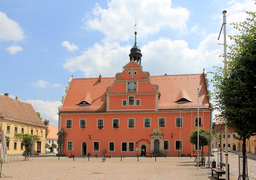 Das Rathaus in Belgern begrenzt den langrechteckigen Marktplatz im Südosten.