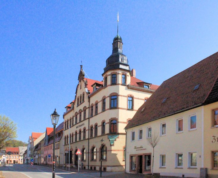 Das Rathaus steht am Marktplatz von Lunzenau in Blockrandbebauung.