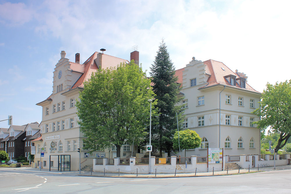Das Rathaus in Mölkau steht als straßenbildprägender Bau in offener Bauweise im Zentrum von Mölkau.
