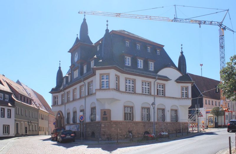 Das Rathaus in Nossen begrenzt den Markt im Südwesten und ist in den Straßenraum der Freiberger Straße hineingerückt.