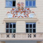 - Putzfassade, Putzquaderung im Erdgeschoss, Rechteck- und Segmentbogenfenster, Gesims, darüber umlaufender Zinnenkranz, Ecktürmchen, Stadtwappen über Haupteingang, Treppengiebel