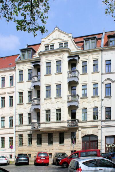Das Wohnhaus Eilenburger Straße 43 in Reudnitz steht am Möbiusplatz in geschlossener Blockrandbebauung.