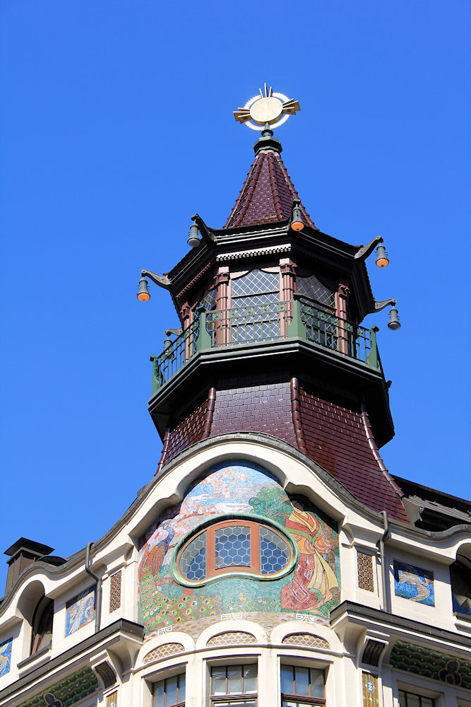 - Putzfassade mit reicher Mosaikgestaltung, abgerundete Eckausbildung mit Giebel, strenge Pfeiler-Riegel-Gliederung, zwei markante Elefantenköpfe an der Ecke