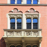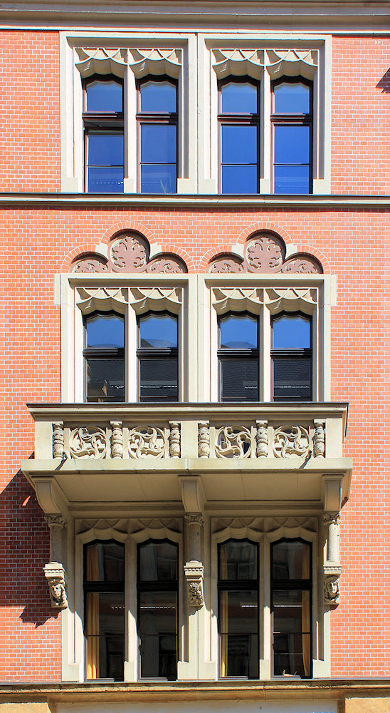 - rote Klinkerfassade mit Sandsteingliederungen, flache Seitenrisalite mit Treppengiebel und Balkon, Arkaden