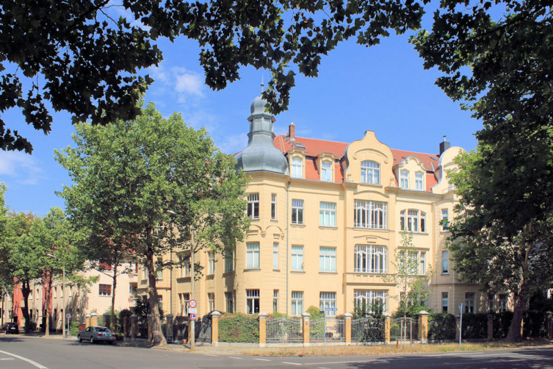 Das Wohnhaus Schönbachstraße 20 in Stötteritz steht in geschlossener Blockrandbebauung zwischen dem Güntz-Park und dem Völkerschlachtdenkmal.