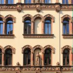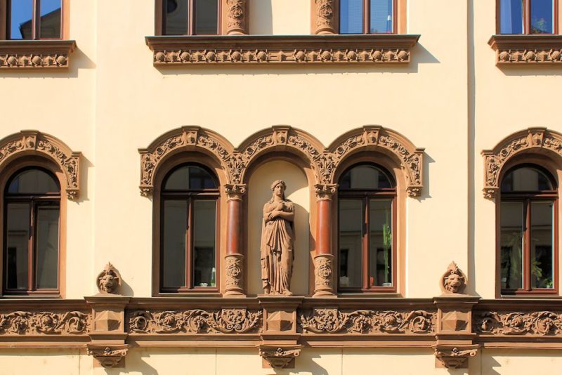 - Putzfassade, auffälliger Fassadenschmuck mit ornamentierten Terrakottafriesen, rote Kunstmarmor-Säulen zwischen gekuppelten Bogenfenstern, Vase und Nischenfigur