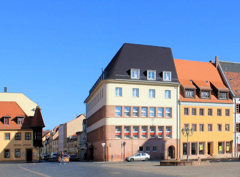 Das Gebäude der Sparkasse in Grimma steht in Ecklage an der Nordseite des Marktplatzes.
