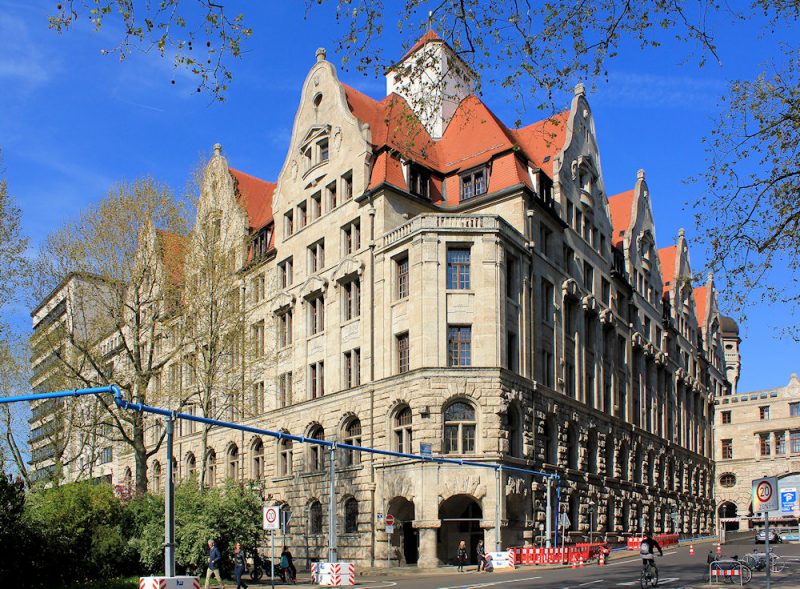 - auf einem Teil des Geländes der ehem. Pleißenburg errichteter, einen Baublock einnehmender, massiver Baukörper auf dreieckigem Grundriss