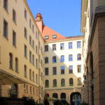 einen Baublock einnehmender Baukomplex um einen langrechteckigen und zwei kleine rechteckige Innenhöfe