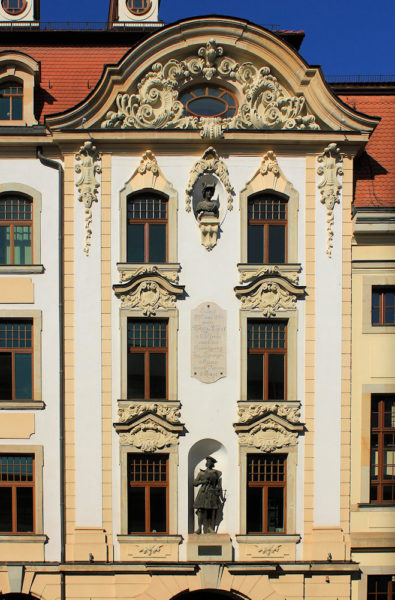 Kaufhaus: Putzfassade, Lisenengliederung, Risalit mit reich dekoriertem Segmentgiebel, Fensterverdachungen in neobarocken Formen, Merkurbüste und Statue Kaiser Maximilian I.