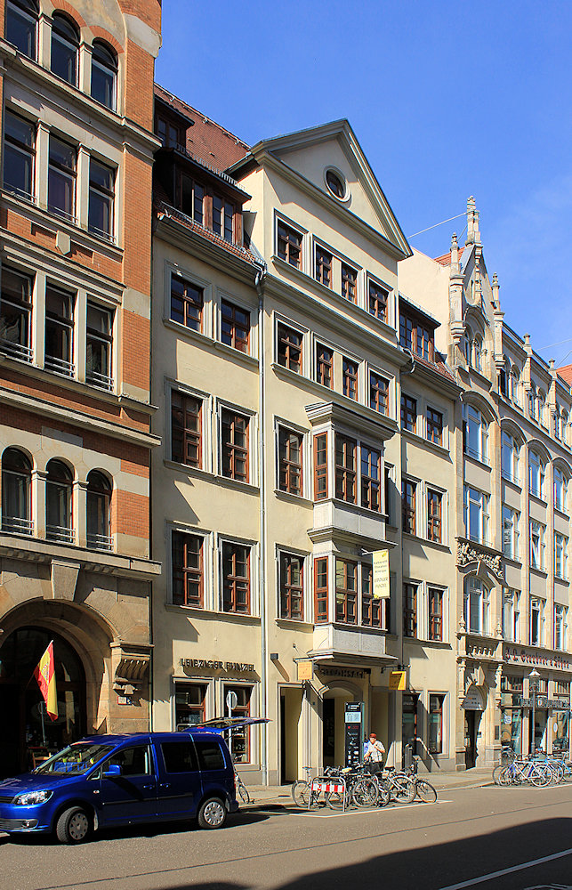 - Ritterstraße: Putzfassade, zweigeschossiger Kastenerker, Dachgaube mit Dreiecksgiebel,