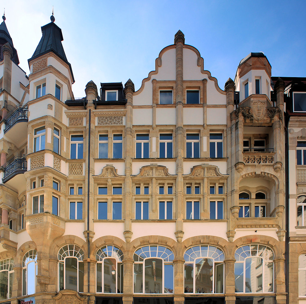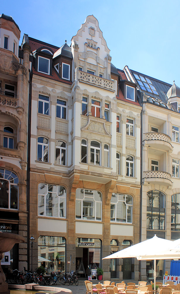 - Barfußgässchen 11: Putzfassade mit reicher Sandsteingliederung, zwei geschlossene Eckerker, dazwischen offener Erkervorbau mit Rundbögen und Dachturm, Wellengiebel,