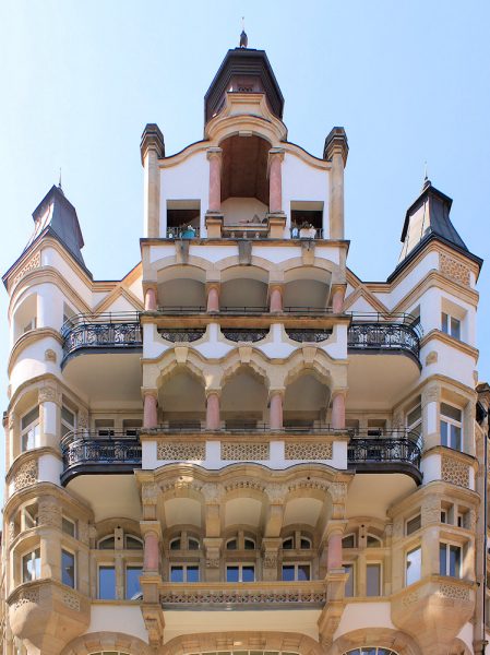 Barfußgässchen 15: Putzfassade mit reicher Sandsteingliederung, offener, runder Eckerker mit Säulen und Balkonüber dem Erdgeschoss, Kastenerker, halbrunde Balkons - Dachform