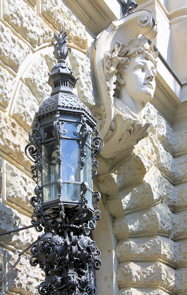 - Natursteinfassade, rustiziertes Sockelgeschoss, darüber Kolossalordnung, fünfachsiger Mittelrisalit mit Attika und Figurenschmuck, Seitenrisalite