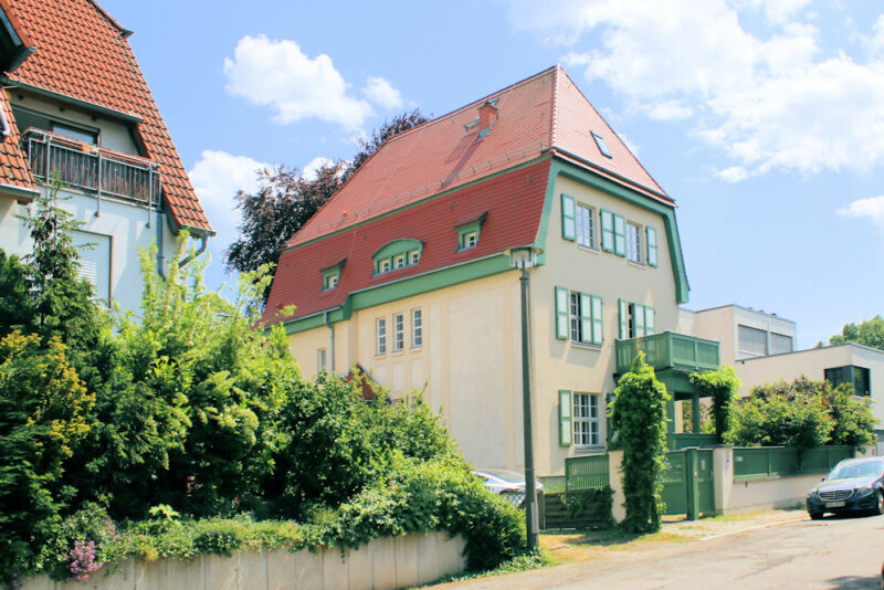 Die Villa Illing steht nahe dem Straßenbahndepot Dölitz in offener Bebauung.
