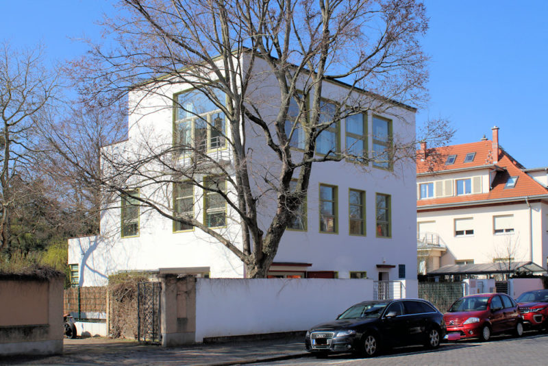 - Putzfassade, zwei Reihen schmale Klappfenster in der unteren Etage, englische Fenster in der Atelieretage, großes Atelierfenster mit Austritt, Terrasse, Fensterfaschen aus gelbgrünen Keramikfliesen, gesimsartiger Fries, durchbrochenes Keramikfeld