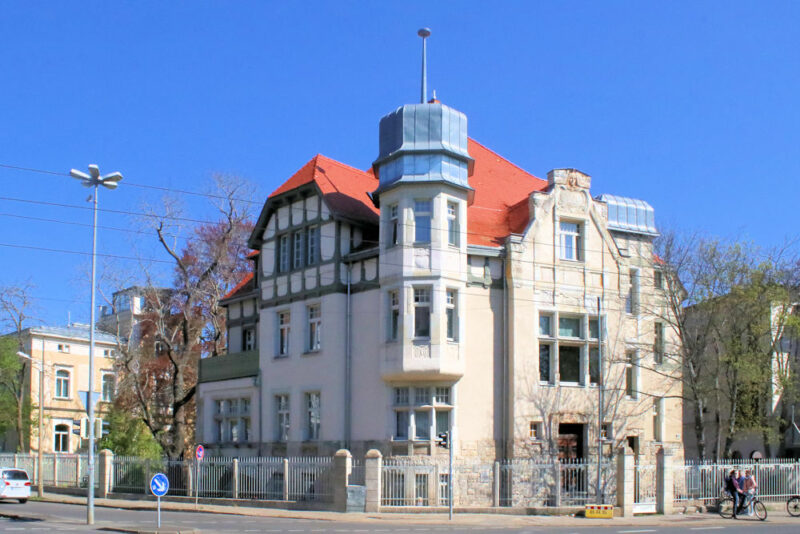 Die Wagner-Nietzsche-Villa in Lindenau steht zwischen der Heilandskirche Plagwitz und dem Felsenkeller in offener Bebauung.