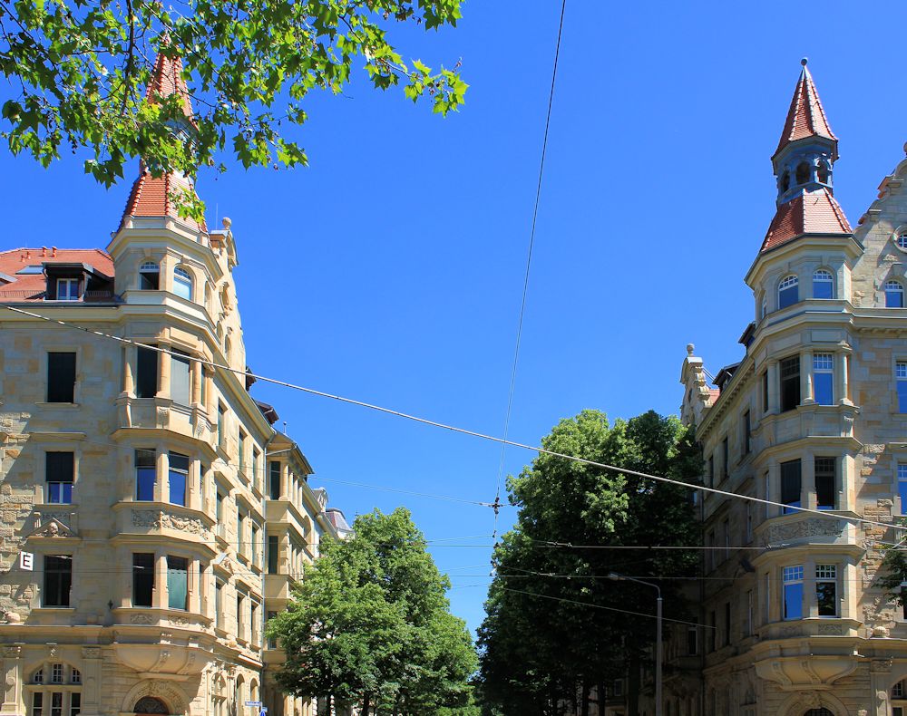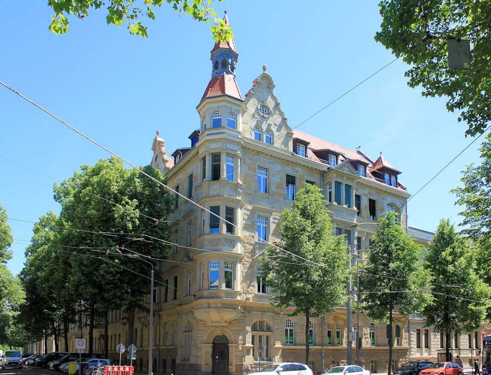 - Sandsteinfassaden, polygonale Eckerker mit Turm, Fensterverdachungen, Gesimse, Zwerchhäuser