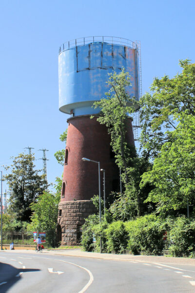 Der Wasserturm des Bahnbetriebswerks West in Schönefeld-Abtnaundorf steht zwischen dem Hauptbahnhof Leipzig und der Berliner Brücke in offener Bebauung.